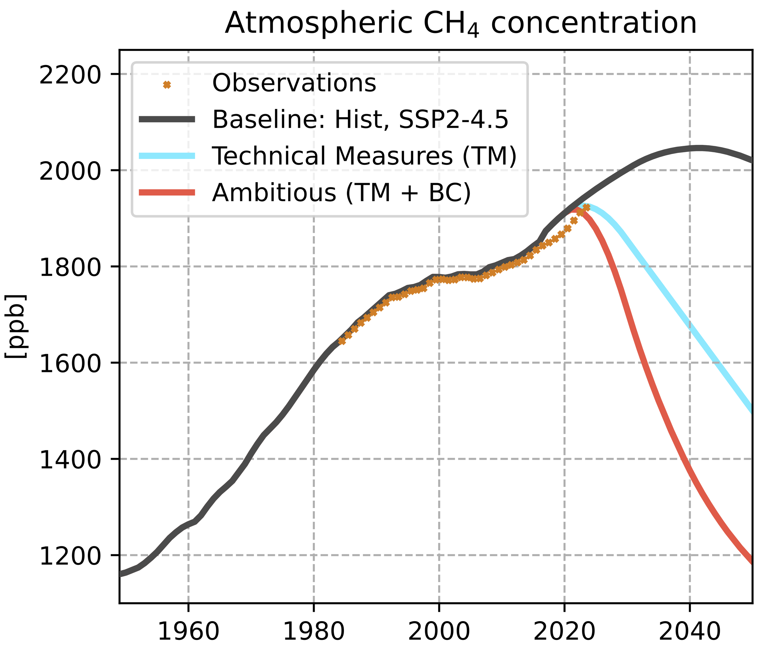 Forcing identical to SSP2-4.5 except methane concentration is prescribed following one of the two methane mitigation pathways (Technical Measures or Ambitious).